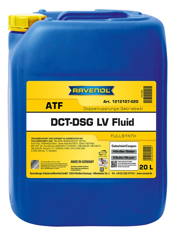 RAVENOL DCT-LV Fluid is used to lubricate clutches in 7-speed Magna GETRAG dual-clutch transmissions (7DCT300/ 6DCT200/ 6DCT150). It can be used in direct shift transmissions with wet or dry clutches.